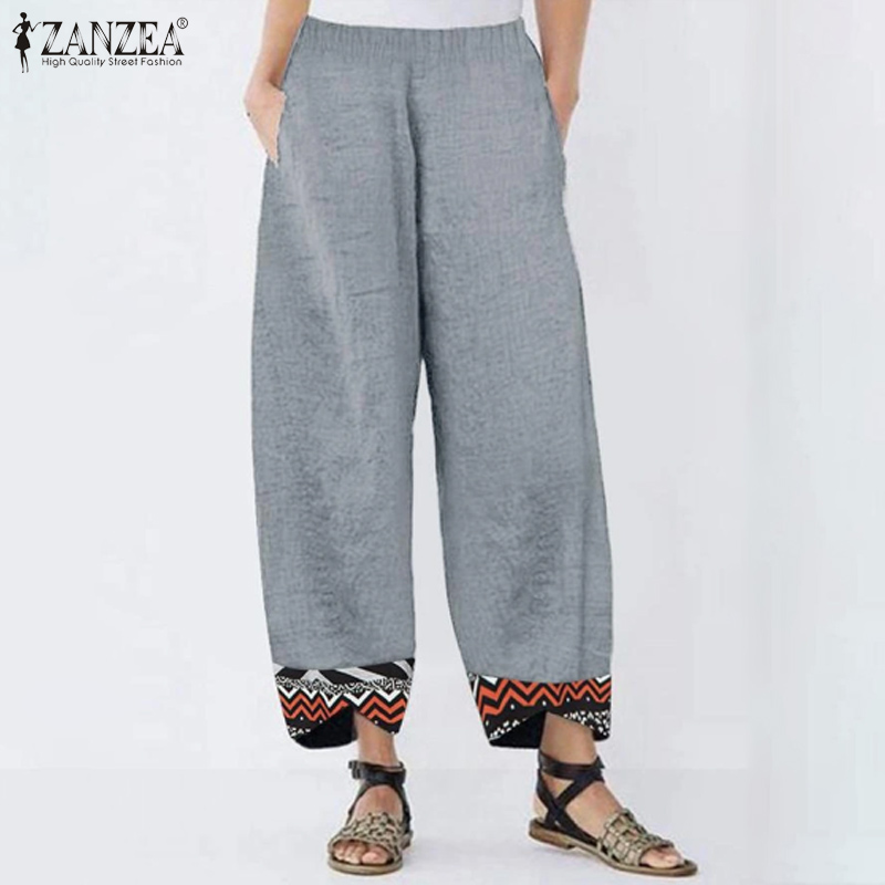 [Clearance Sale]ZANZEA Clearance Sale Womens Summer Elastic Waist Casual Pants Printed Hem Wide Leg Trousers CLE