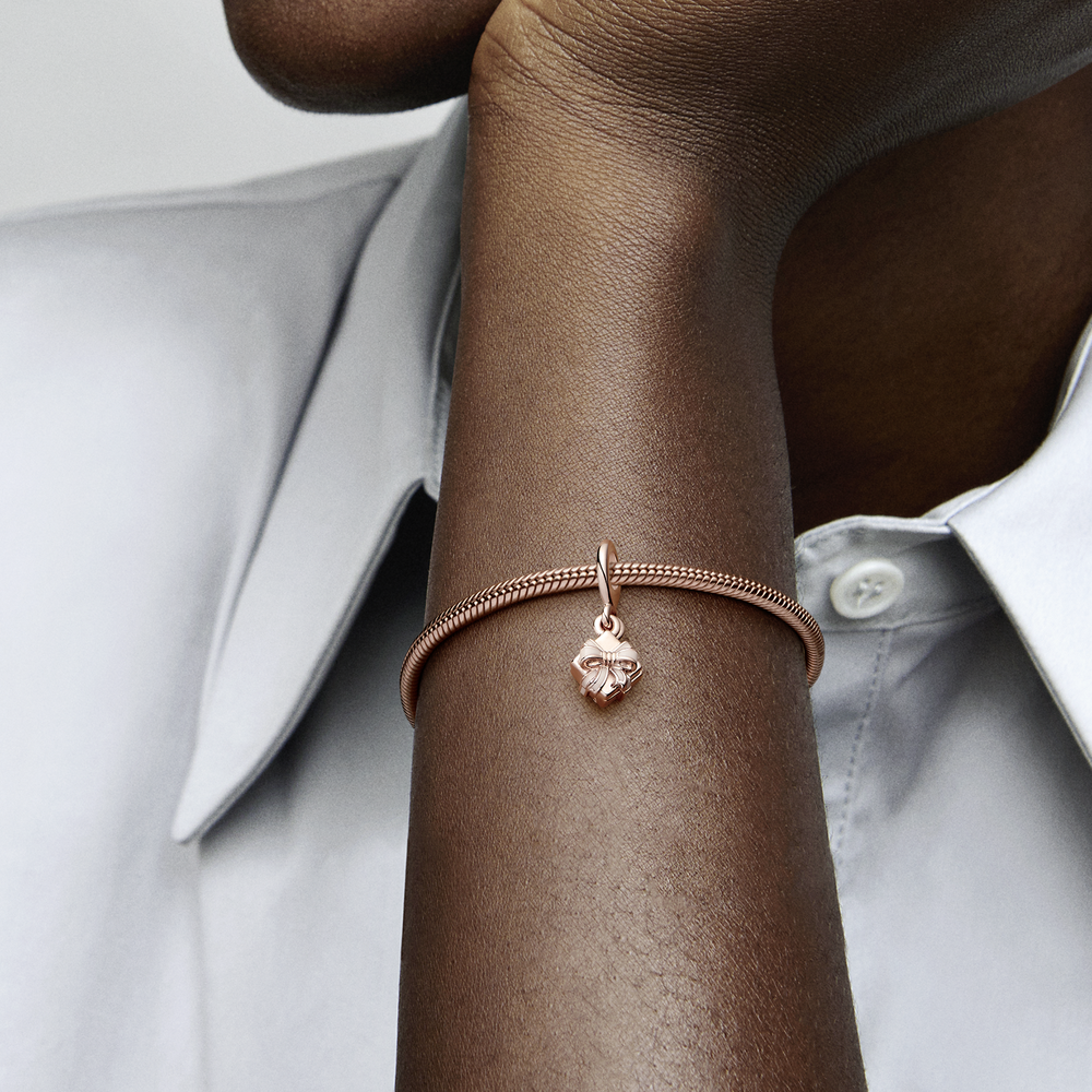 A sweet gift to make your loved one's birthday even more special. The Openable Birthday Gift Dangle Charm is finished in warm 14k rose gold plating and is shaped like a gift box with a soft pink enamel ribbon and bow. Open the box and you'll discover a raised heart with the engraved message "Happy Birthday." A special jewellery gift they can wear all year to remember that birthday glow.