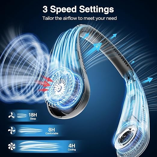 • 【Up to 18 Running Hrs & 3 Speed Settings】The neck fans that blow cool air feature 3 modes (Sleep/Comfortable/Cooling) and 3 speeds from soothing-soft to cooling-strong, you can easily adjust the air flow speed according to your comfort by simply pressing the power button. With a built-in 6000mAh rechargeable battery, the neck fan rechargeable works up to 18 hours continuously in sleep mode (at 40% volume) or 4 hours in cooling mode. A single charge lasts a long time and keeps you cool all day